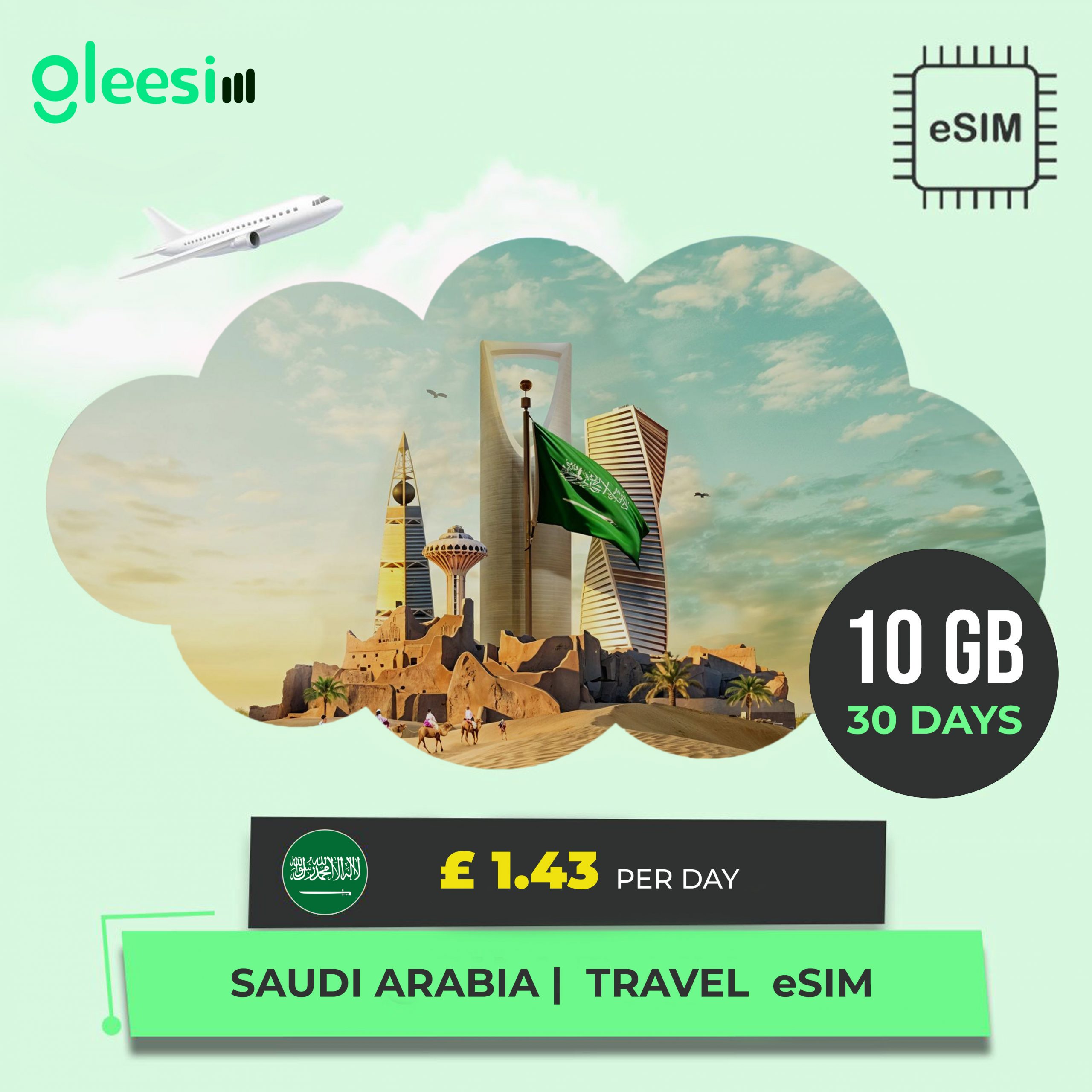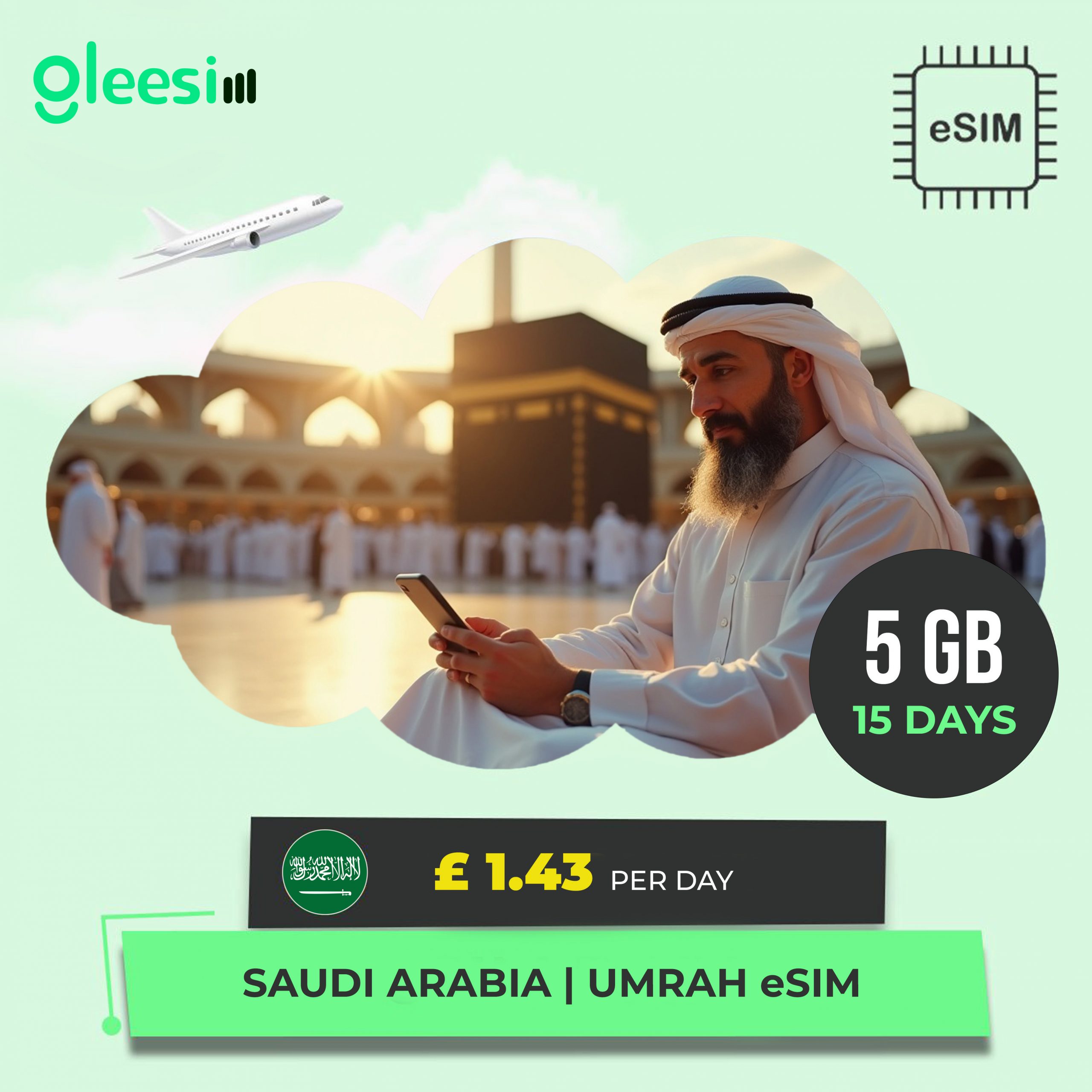 Enjoy perfect connectivity with Gleesim’s eSIM Saudi Arabia. Whether you’re going for a trip to Riyadh, Jeddah or Mecca, our Saudi Arabia eSIM provides you with speedy, cheap and safe mobile data connectivity – all with instant activation when you step off the plane. With stable internet, you can manage your schedule, book Hajj and Umrah permits, and remain informed during your pilgrimage by using the NUSUK app.